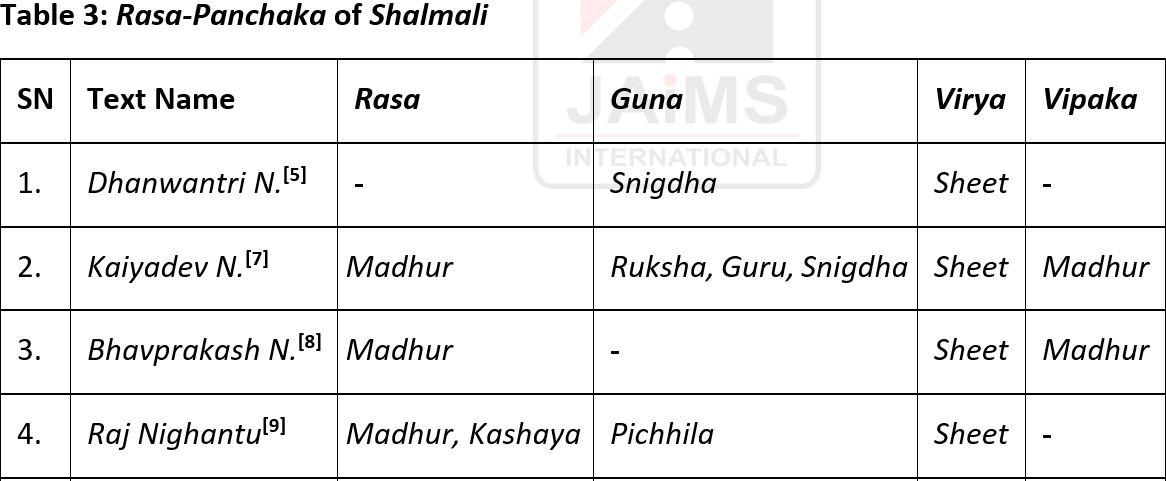 Vaidya BG. Nighantu Adarsha. Vol 1. Reprint ed. Varanasi: Chaukhambha Vidya Bhawana; 2018. Salmalyadi Varga. p. 174, 180.