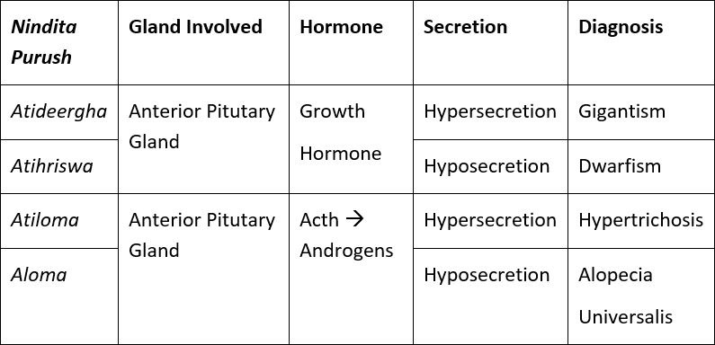Ayurveda is one of the oldest systems of traditional medicine known worldwide. Despite its ancient origins, much of the deep knowledge within this system remains unexplored. By combining insights from different traditional medical systems, new pathways for discovering herbal medicines could emerge. In Ayurvedic texts, Acharya Charak describes eight types of undesirable bodily constitutions called Nindya Prakritis. These include Atideergha (excessive height), Atihriswa (extremely short stature), Atigaur (excessive fair complexion), Atikrishna (excessive dark complexion), and Atiloma (abundant body hair) or absent body hair, excessive thinness, and overweight. The concept of Ashtanindita Purusha refers to individuals who are considered socially unacceptable due to their distinctive physical traits. However, this concept goes beyond social stigma, as these traits can indicate various systemic disorders that may lead to serious health conditions, including life-threatening ones. This study aims to examine the concept of Ashtanindita Purusha from a scientific perspective, particularly focusing on its implications in endocrinology.